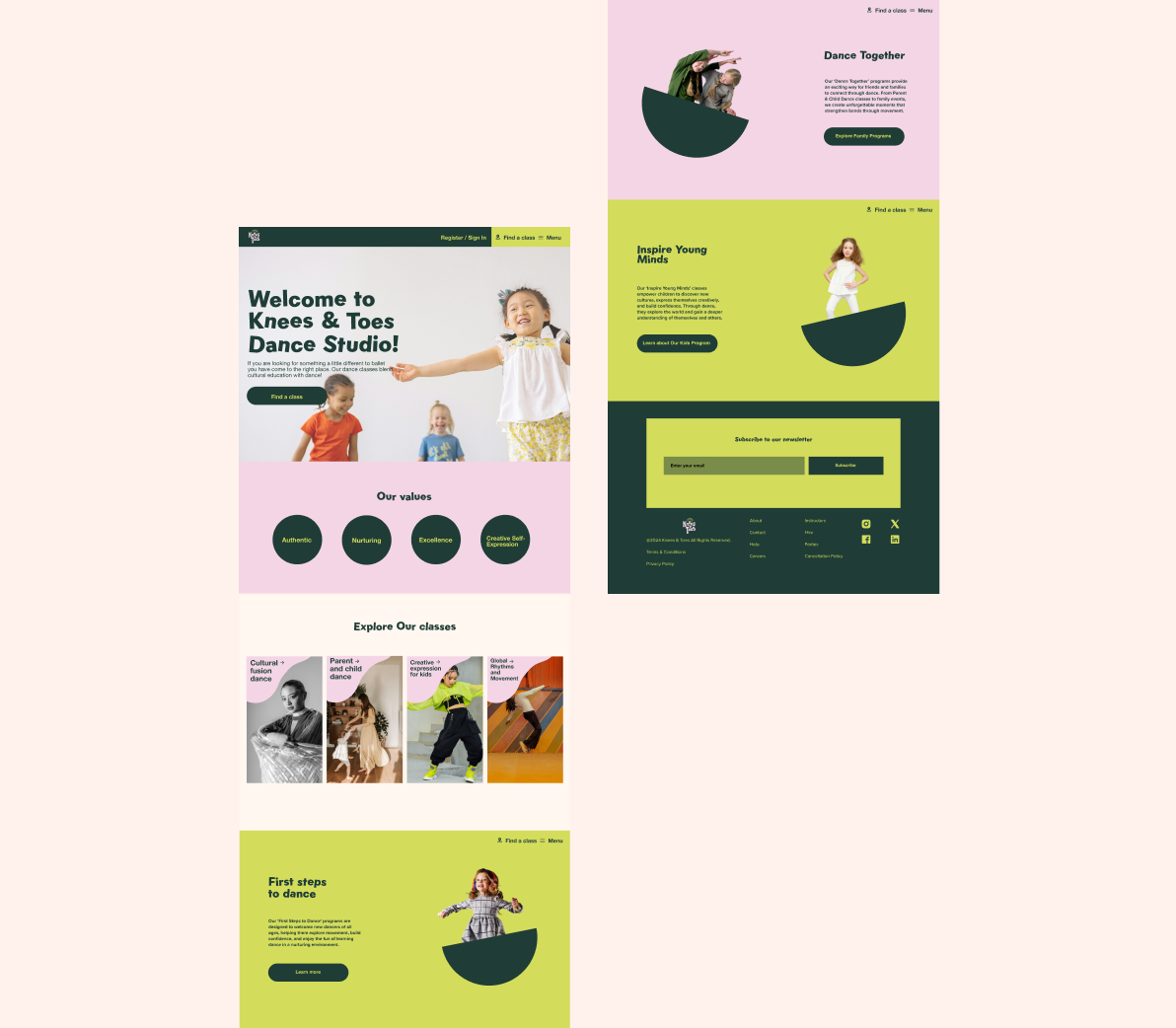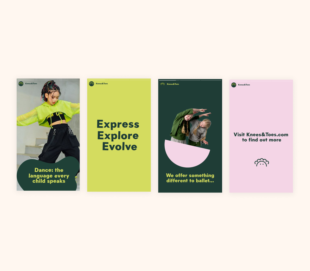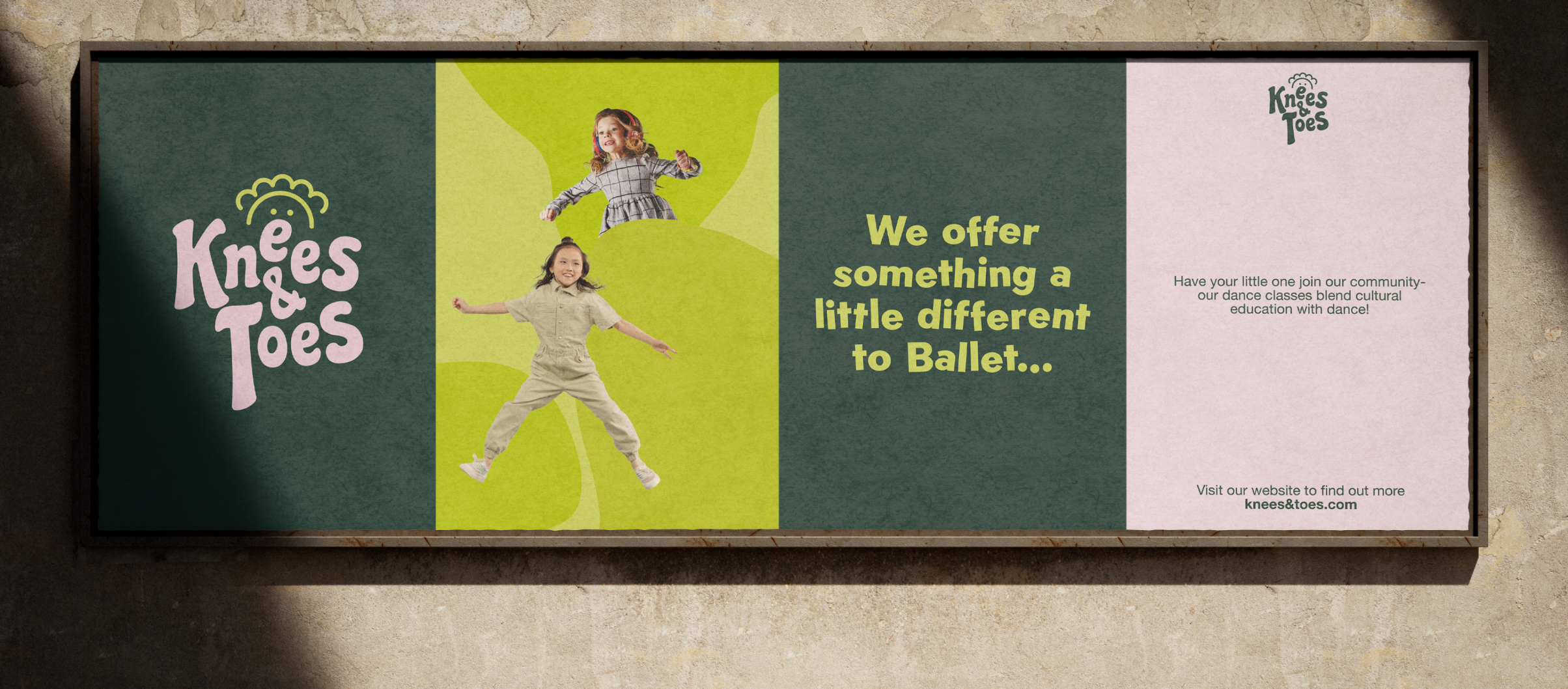 A branding project for Knees & Toes, a company dedicated to offering a unique alternative to traditional ballet by blending cultural education with dance. The brand captures the essence of creativity and self-expression, empowering children to explore diverse cultures and evolve through movement.